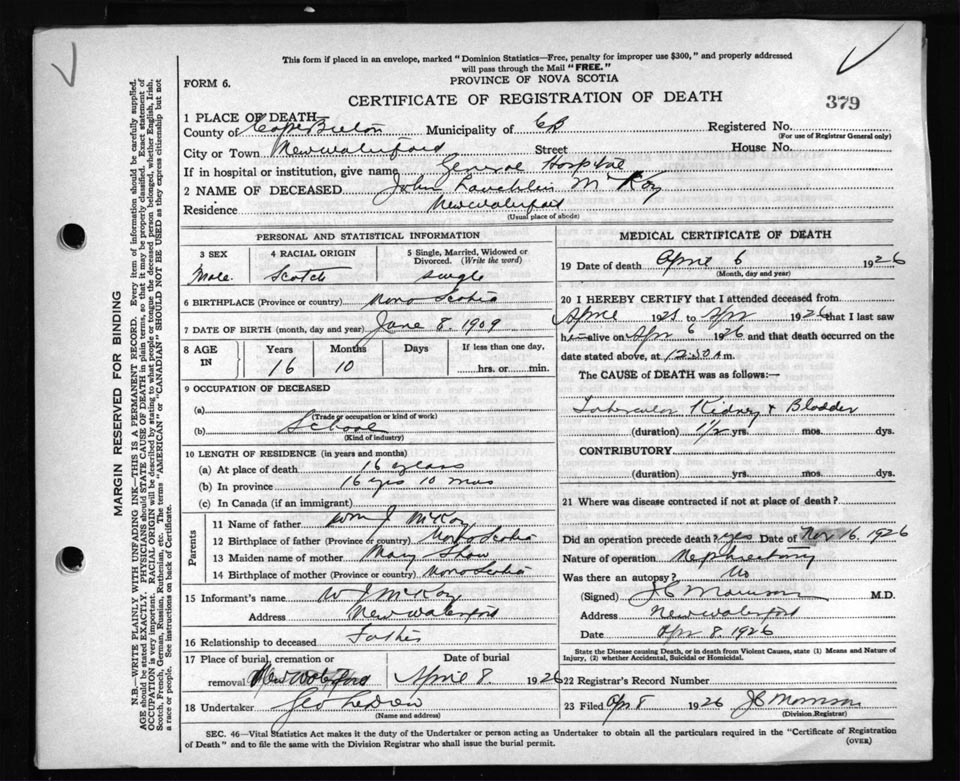 Death Registration: Year: 1926 file: 81 number: 379