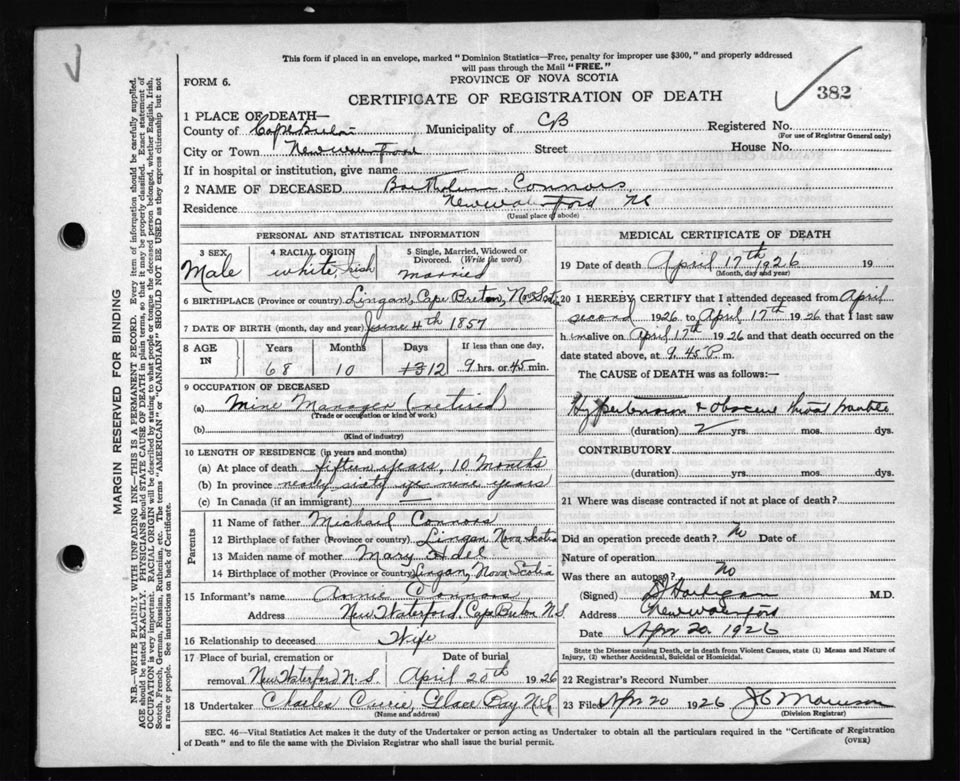 Male Death Registration: Year: 1926 file: 81 number: 382