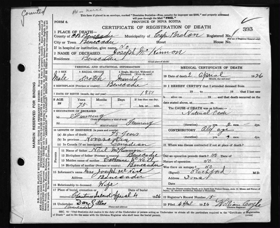 Male Death Registration: Year: 1926 file: 81 number: 393
