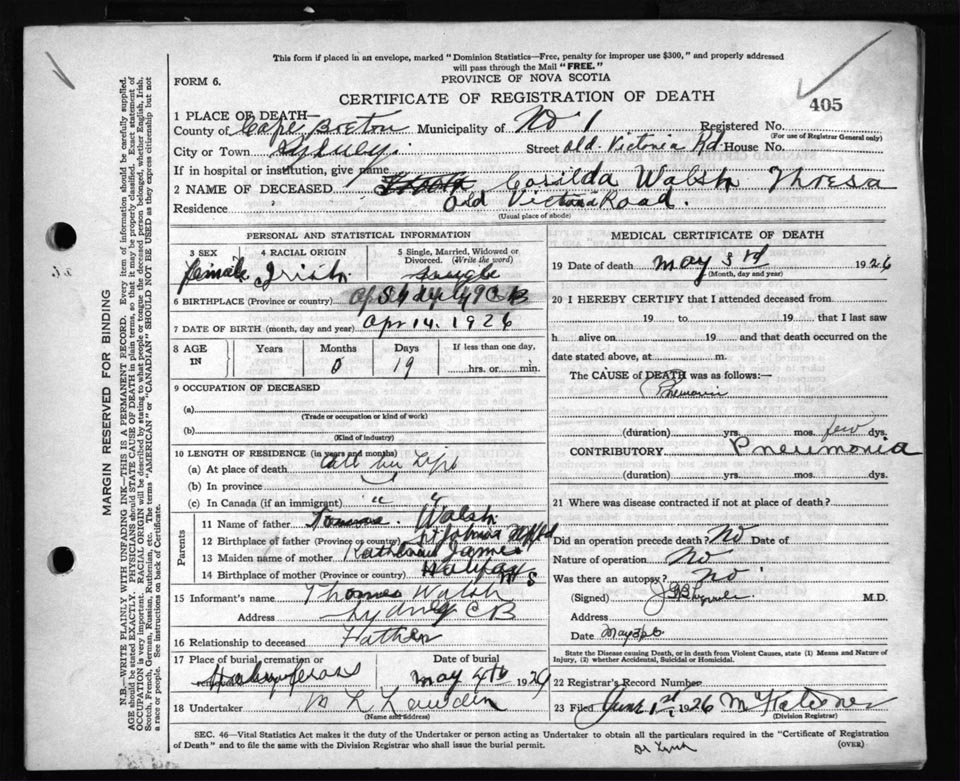 Female Death Registration: Year: 1926 file: 81 number: 405