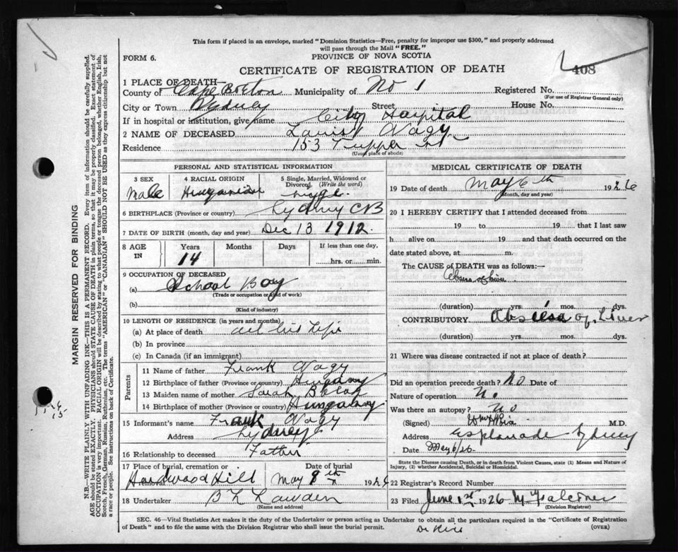 Death Registration: Year: 1926 file: 81 number: 408