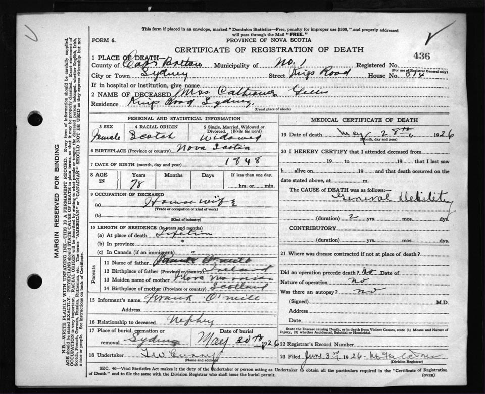 Female Death Registration: Year: 1926 file: 81 number: 436