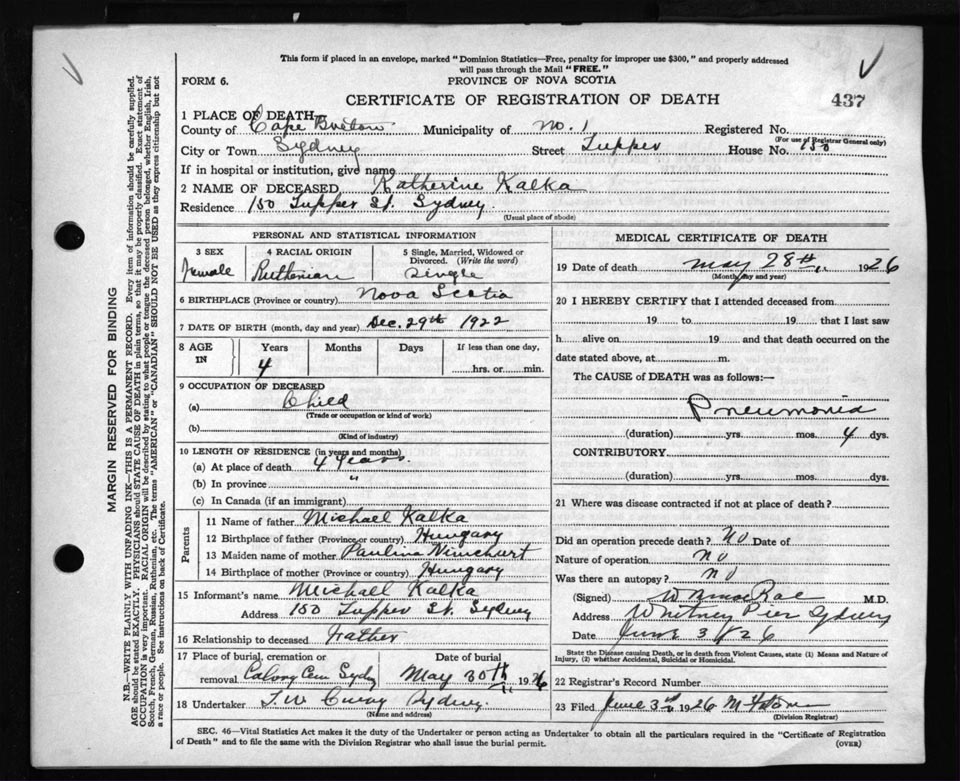 Female Death Registration: Year: 1926 file: 81 number: 437
