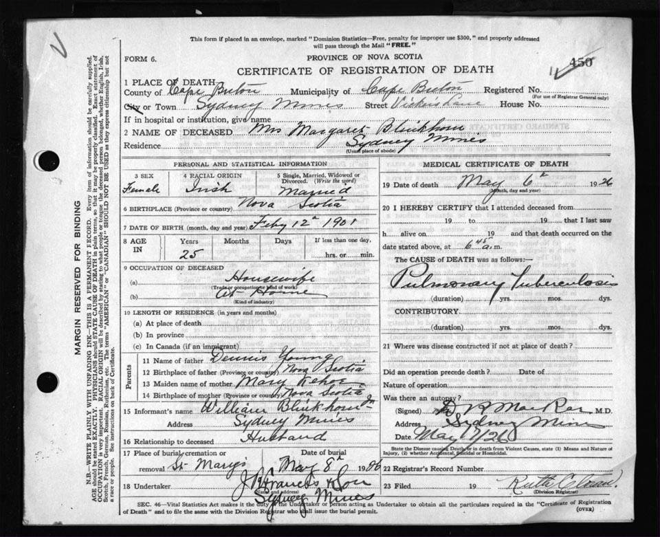 Female Death Registration: Year: 1926 file: 81 number: 450