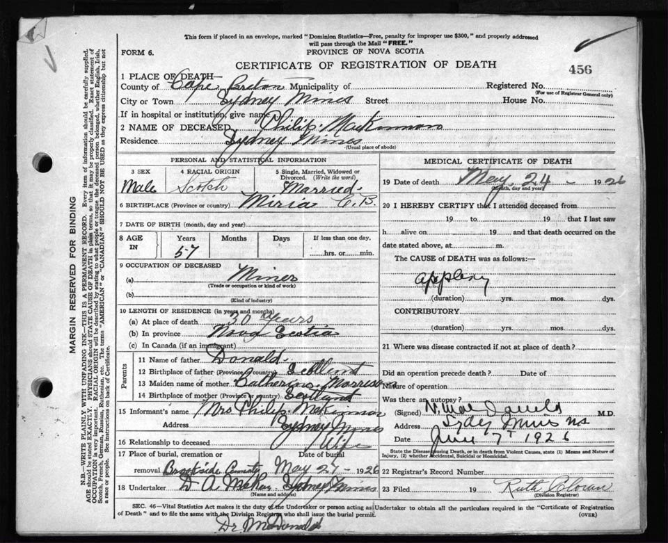 Male Death Registration: Year: 1926 file: 81 number: 456