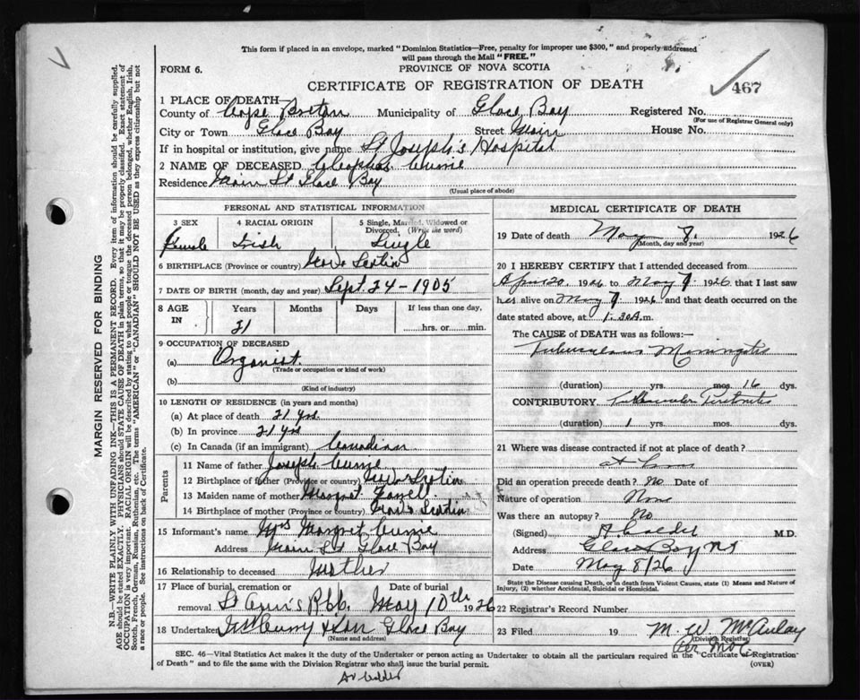Female Death Registration: Year: 1926 file: 81 number: 467