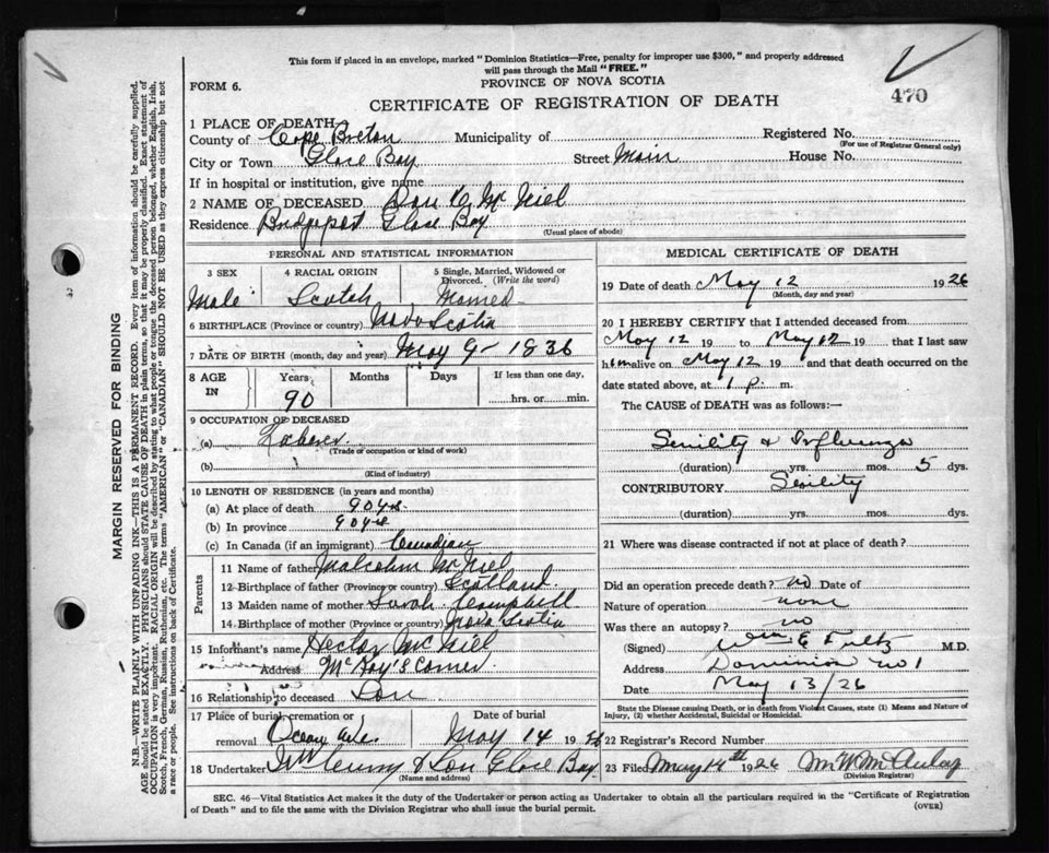 Male Death Registration: Year: 1926 file: 81 number: 470