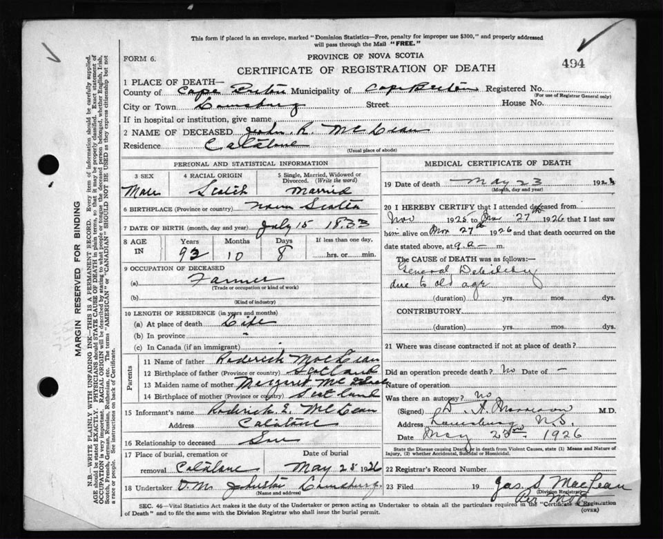 Male Death Registration: Year: 1926 file: 81 number: 494