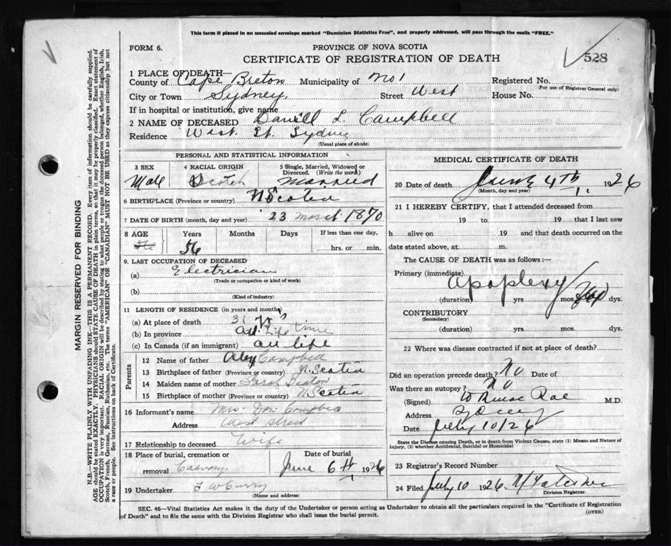 Male Death Registration: Year: 1926 file: 81 number: 528
