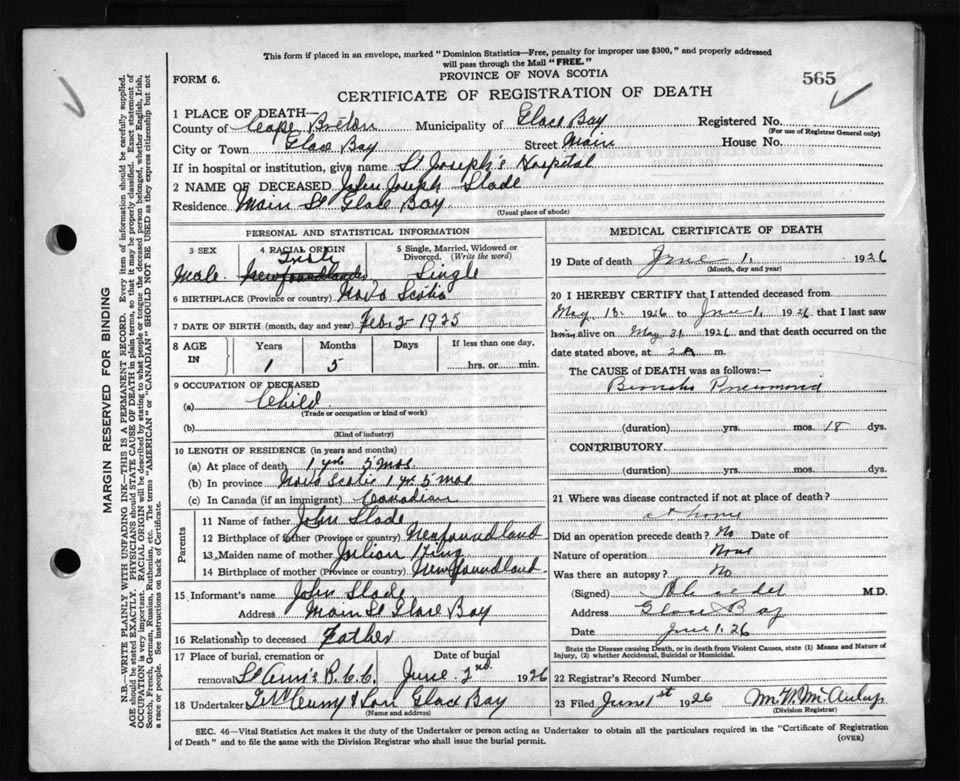 Male Death Registration: Year: 1926 file: 81 number: 565