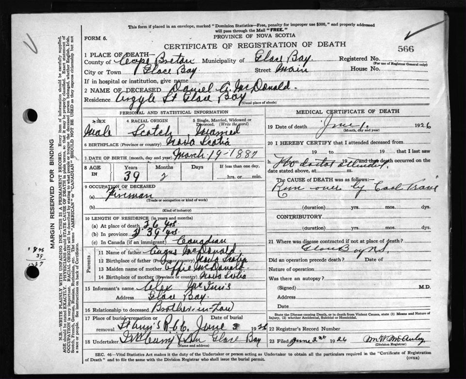 Male Death Registration: Year: 1926 file: 81 number: 566