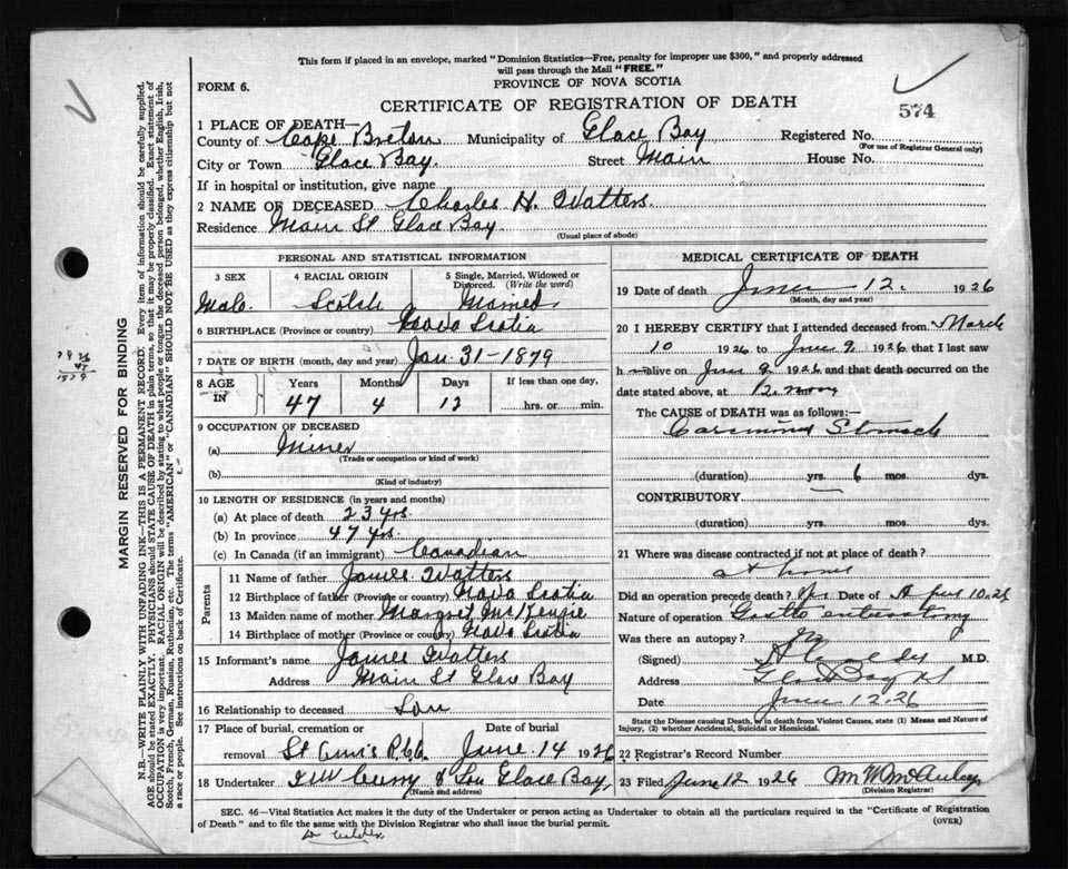 Male Death Registration: Year: 1926 file: 81 number: 574