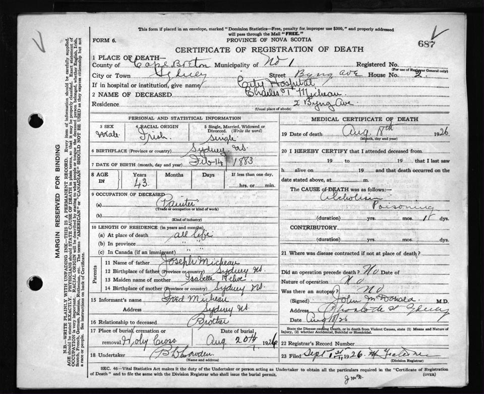 Male Death Registration: Year: 1926 file: 81 number: 687