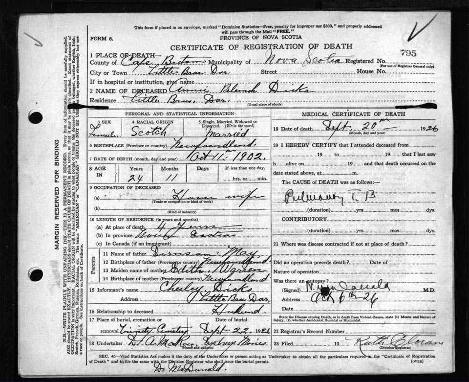 Female Death Registration: Year: 1926 file: 81 number: 795