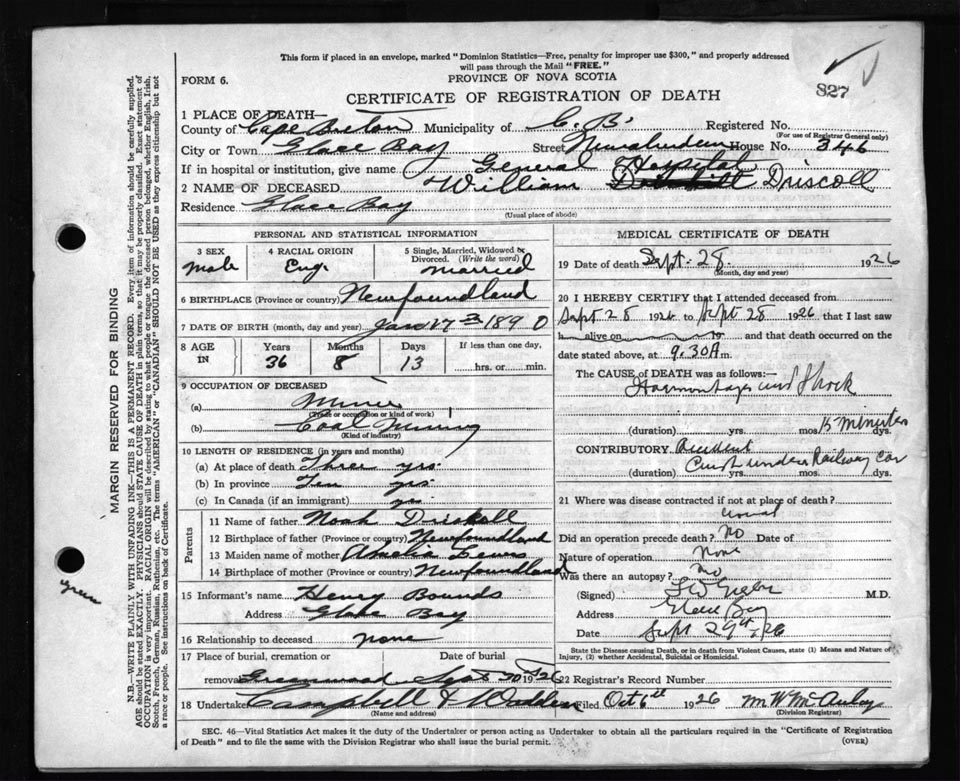 Male Death Registration: Year: 1926 file: 81 number: 827