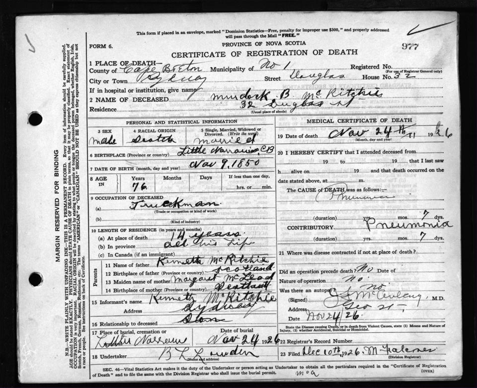 Male Death Registration: Year: 1926 file: 81 number: 977