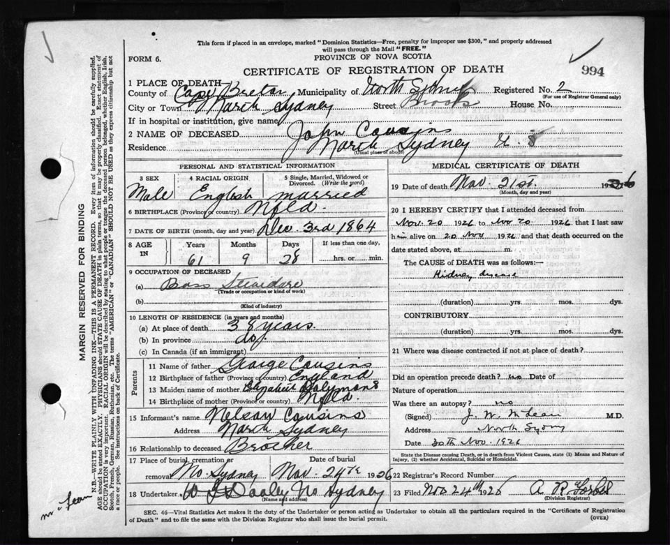 Male Death Registration: Year: 1926 file: 81 number: 994