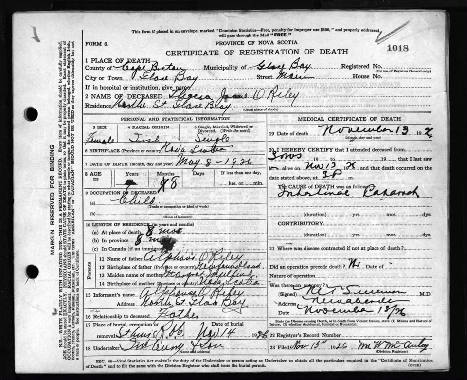 Female Death Registration: Year: 1926 file: 81 number: 1018
