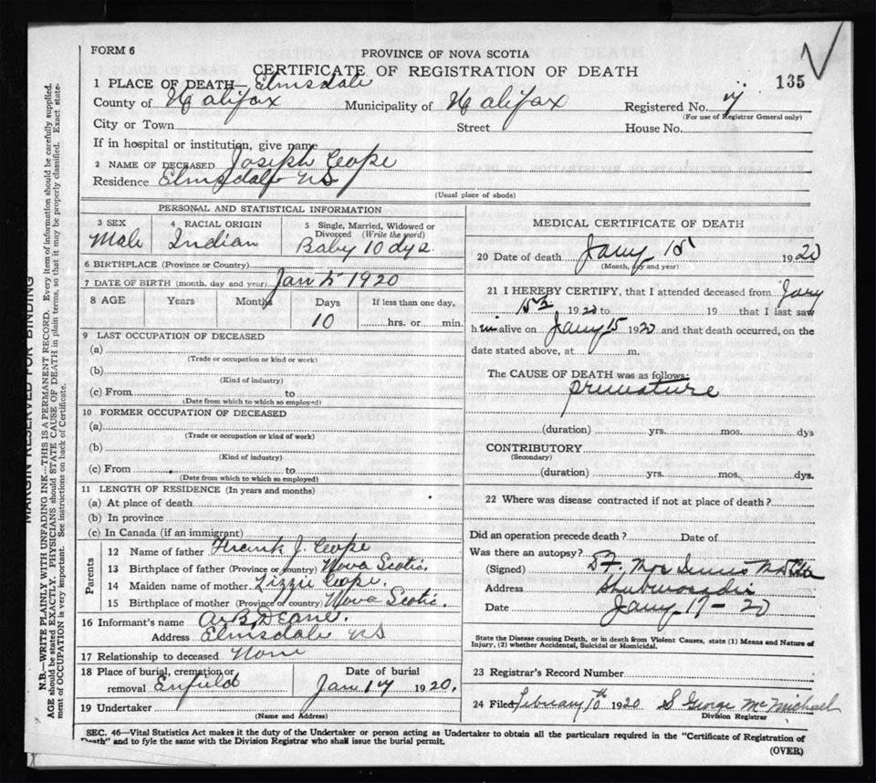 Death Registration: Year: 1920 file: 82 number: 135