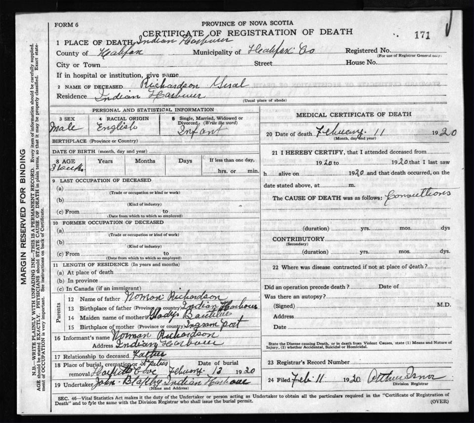 Death Registration: Year: 1920 file: 82 number: 171