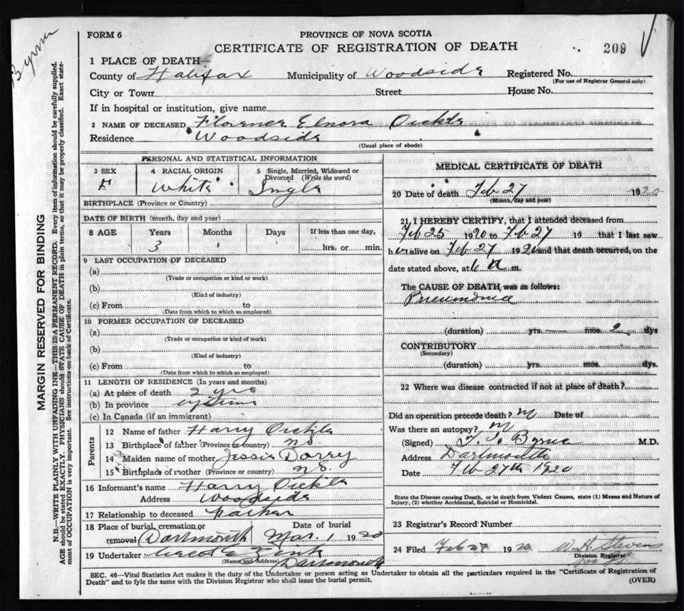 Death Registration: Year: 1920 file: 82 number: 209