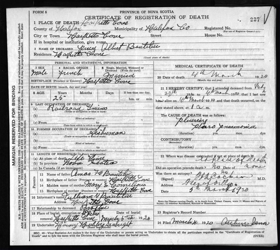 Death Registration: Year: 1920 file: 82 number: 227