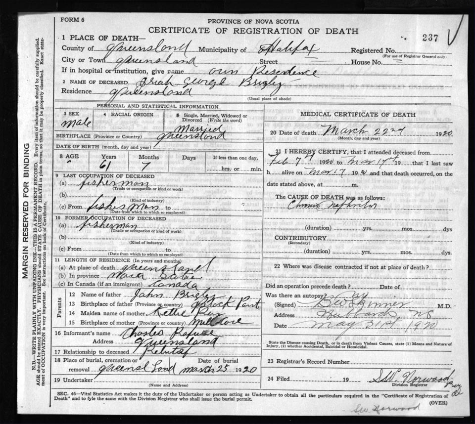 Death Registration: Year: 1920 file: 82 number: 237