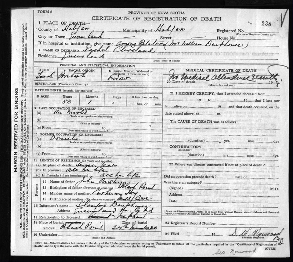 Death Registration: Year: 1920 file: 82 number: 238