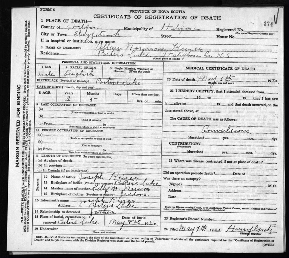 Death Registration: Year: 1920 file: 82 number: 374