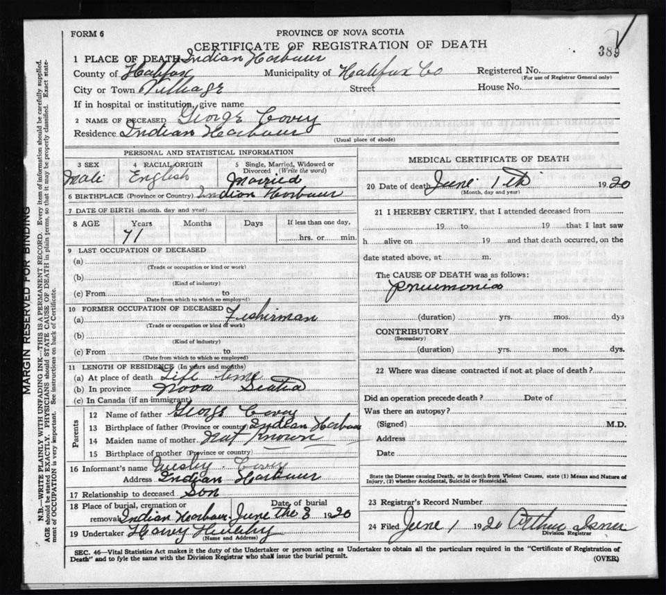 Death Registration: Year: 1920 file: 82 number: 389