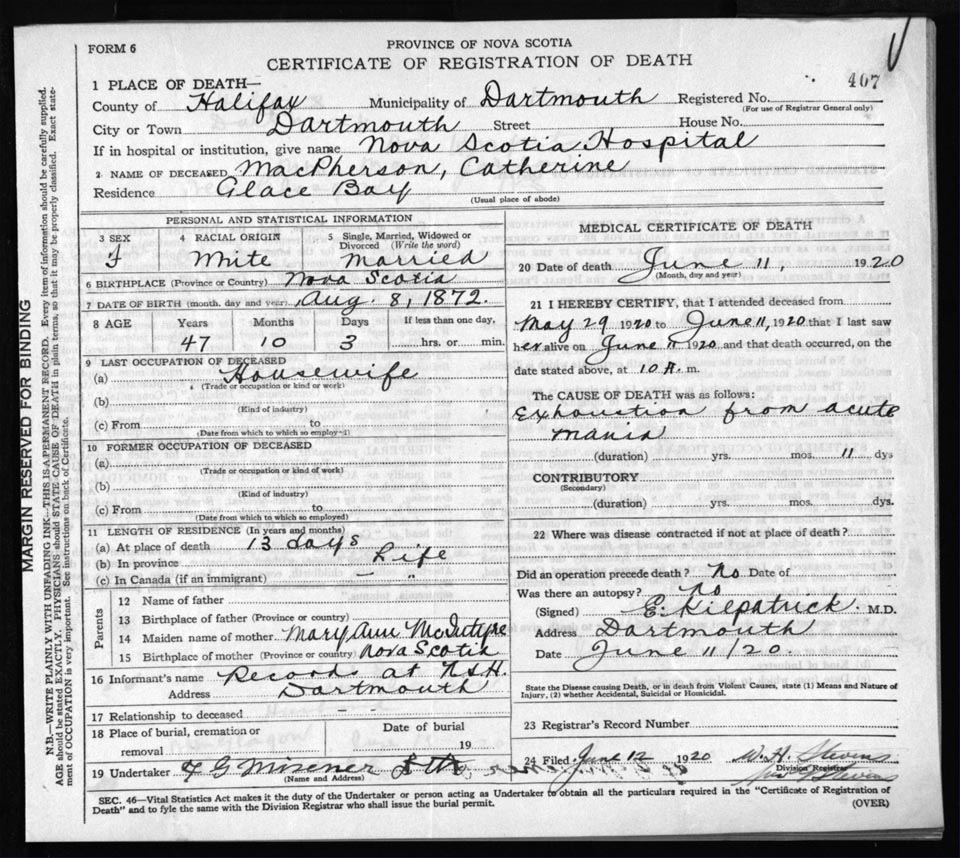 Death Registration: Year: 1920 file: 82 number: 407