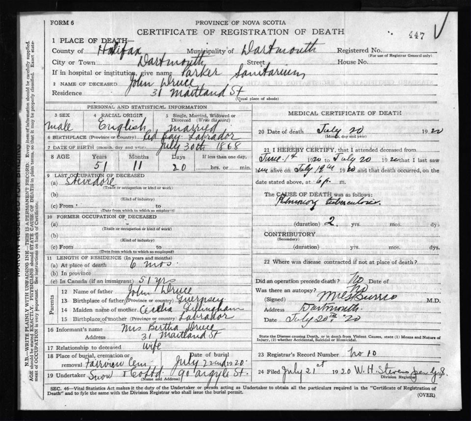 Death Registration: Year: 1920 file: 82 number: 447