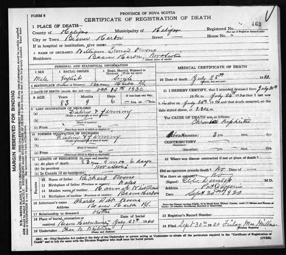 Death Registration: Year: 1920 file: 82 number: 462