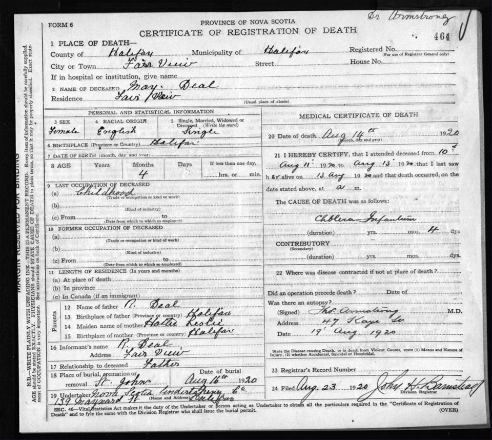 Death Registration: Year: 1920 file: 82 number: 464