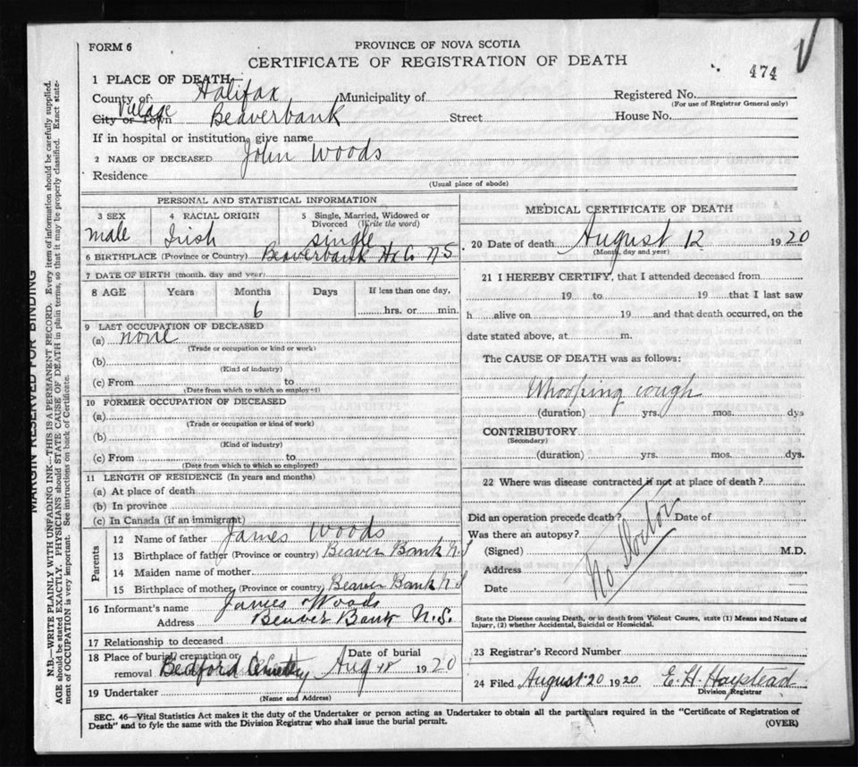 Death Registration: Year: 1920 file: 82 number: 474