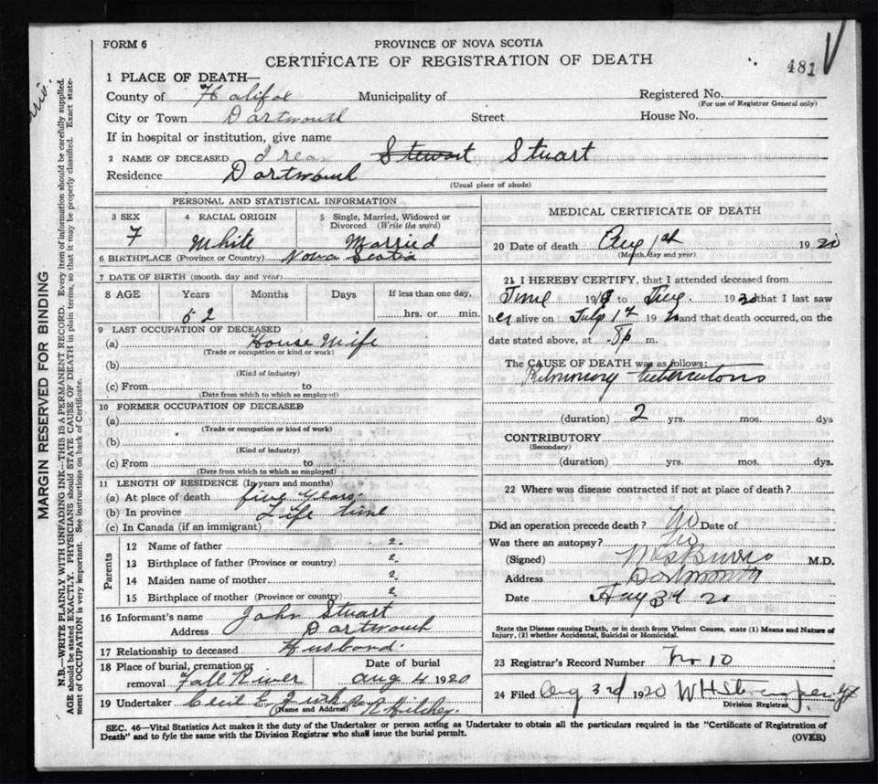 Death Registration: Year: 1920 file: 82 number: 481