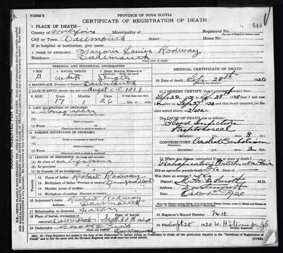 Death Registration: Year: 1920 file: 82 number: 549