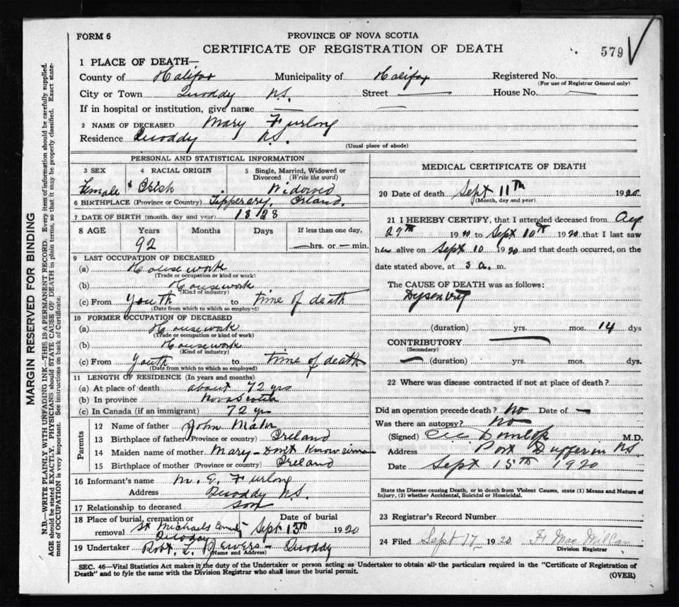 Death Registration: Year: 1920 file: 82 number: 579