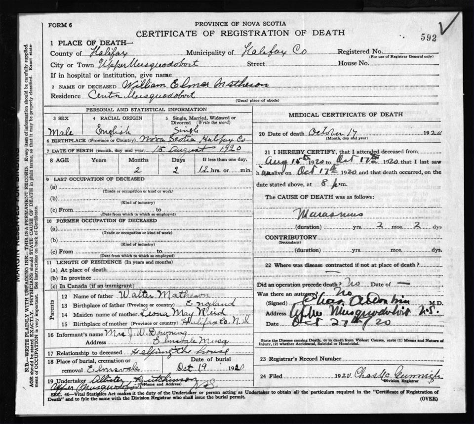 Death Registration: Year: 1920 file: 82 number: 592