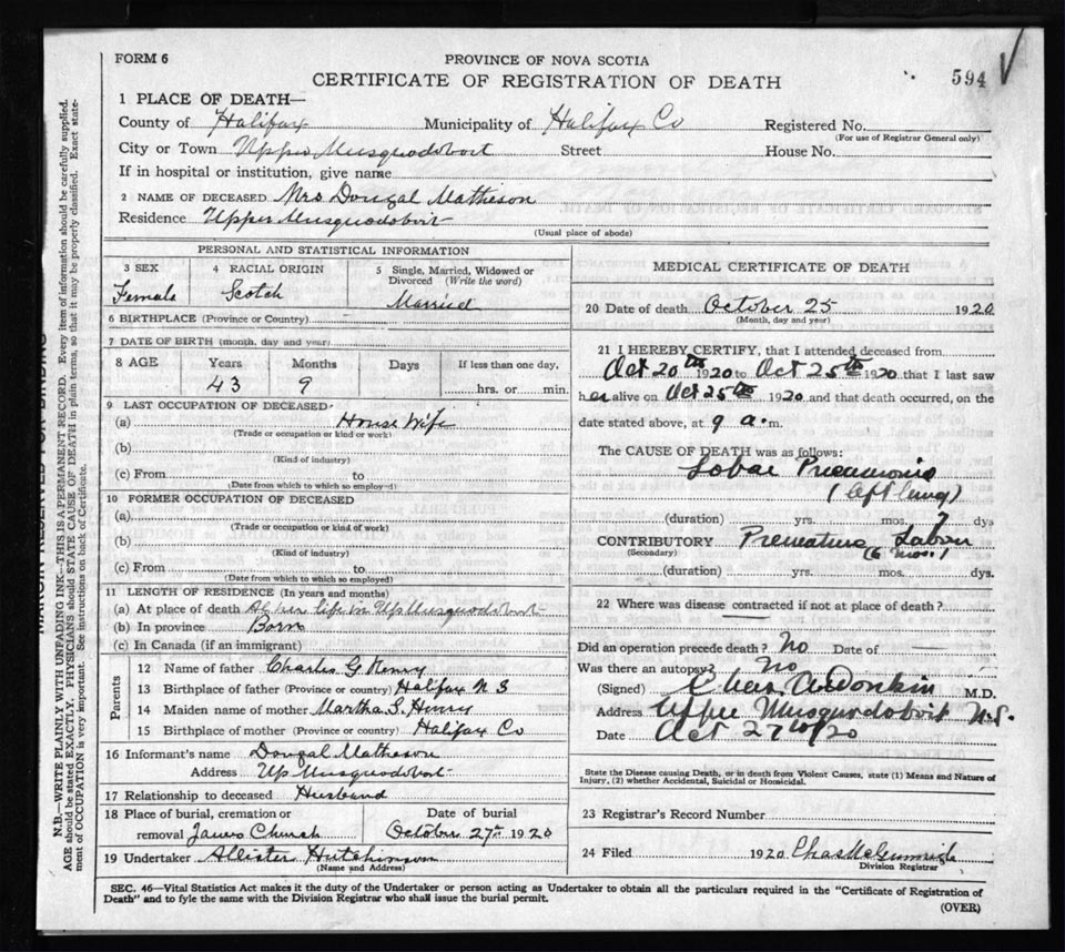 Death Registration: Year: 1920 file: 82 number: 594