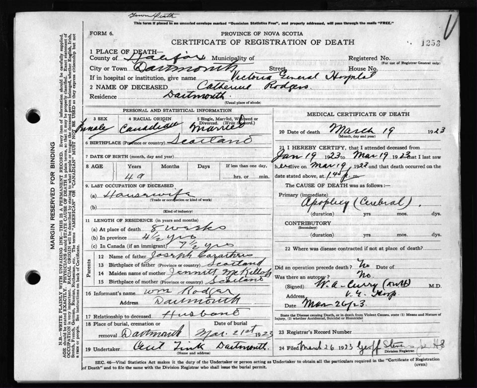 Death Registration: Year: 1923 file: 83 number: 1253