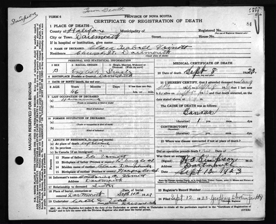 Death Registration: Year: 1923 file: 84 number: 84