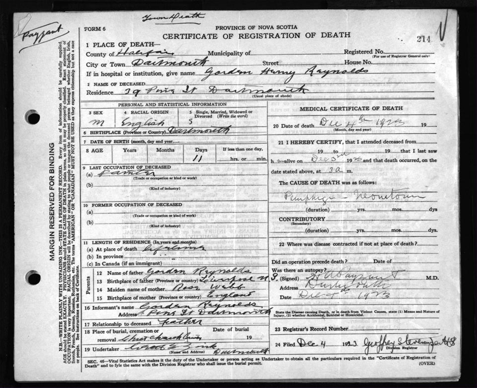 Death Registration: Year: 1923 file: 84 number: 214