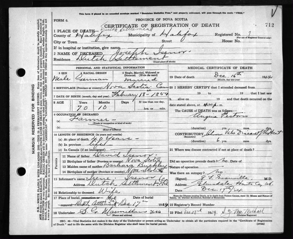Death Registration: Year: 1924 file: 84 number: 712