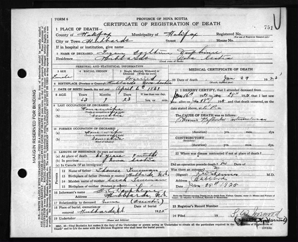 Death Registration: Year: 1925 file: 84 number: 751