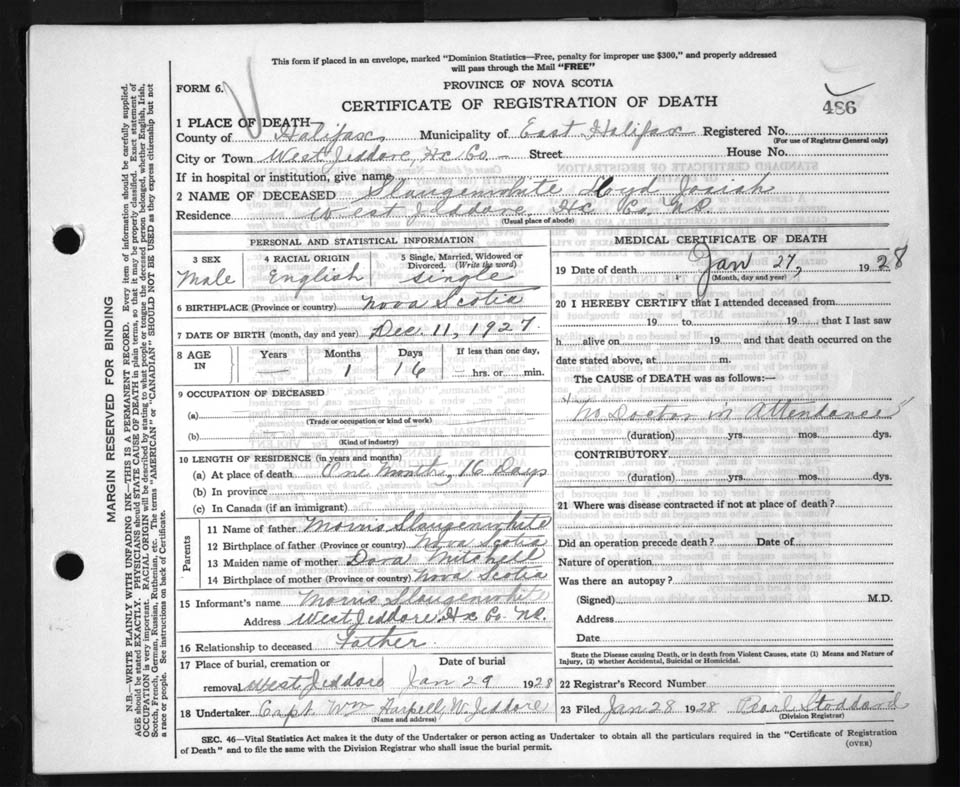 Male Death Registration: Year: 1928 file: 85 number: 486