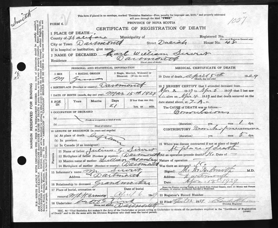 Male Death Registration: Year: 1929 file: 85 number: 1057