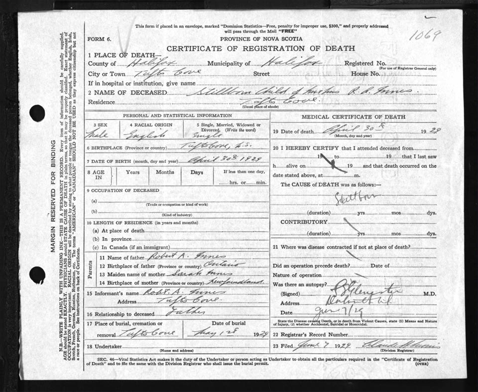 Male Death Registration: Year: 1929 file: 85 number: 1069