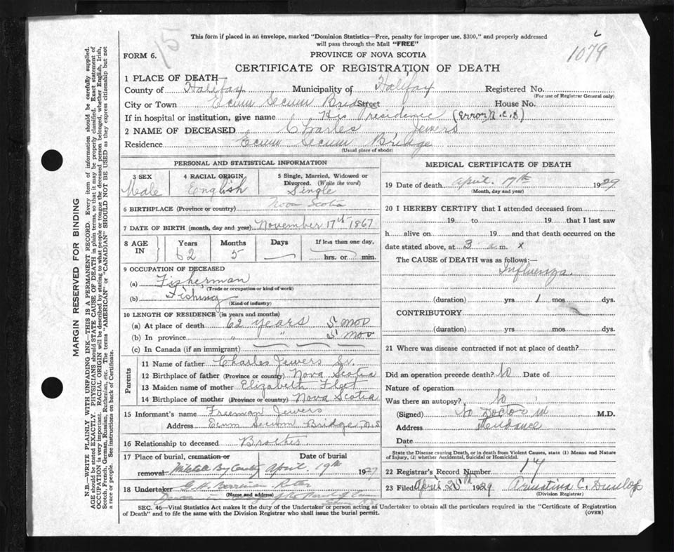Male Death Registration: Year: 1929 file: 85 number: 1079