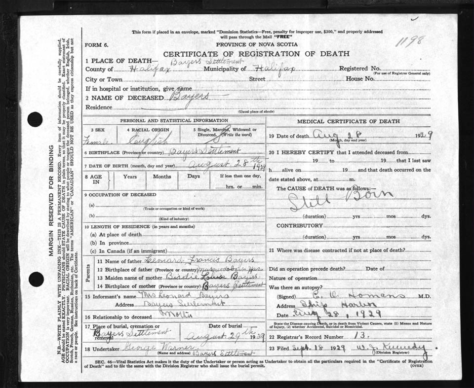 Female Death Registration: Year: 1929 file: 85 number: 1198
